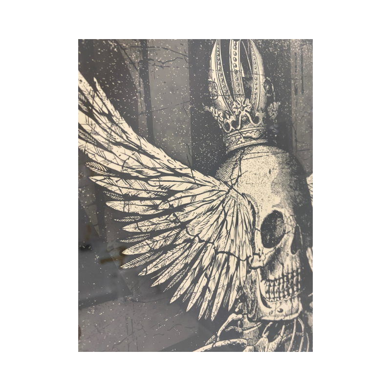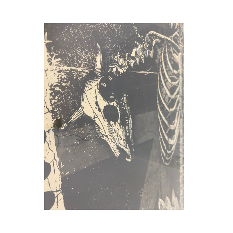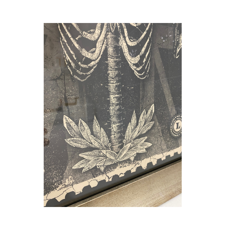 This vintage-style skull print is an absolute stunner. It's been framed in a champagne-coloured timber frame, adding a touch of elegance to the whole piece. Signed by the artist! The outside dimensions of the frame are approximately 67cm x 54cm, making it a substantial and eye-catching artwork. The combination of the vintage aesthetic, the detailed skull print, and the high-quality frame truly make this piece a must-have for any art enthusiast