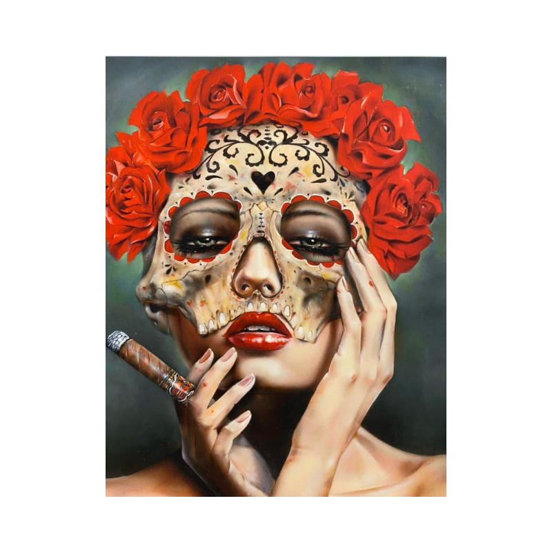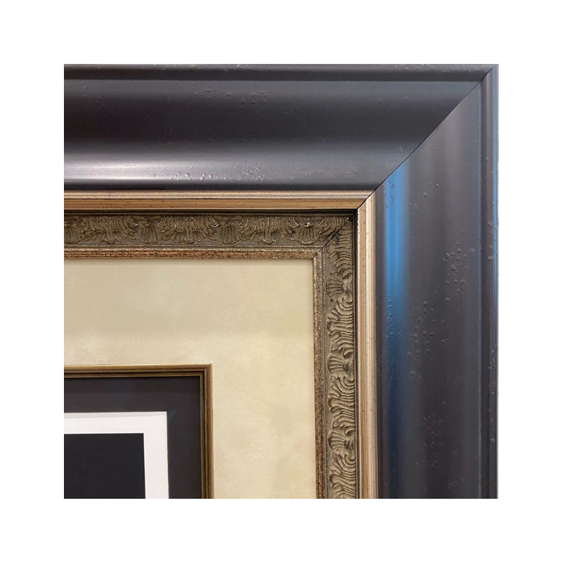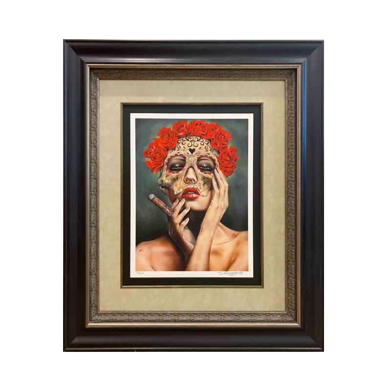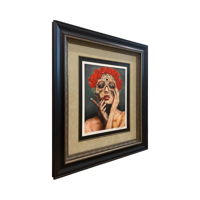 This limited edition print by Brian Viveros, titled Frida Le Muerte is striking and evocative piece that blends elements of surrealism and gothic art. The print features a portrayal of a female figure, inspired by the iconic Frida Kahlo, depicted with dramatic and vivid imagery. The subject is adorned with bold makeup, floral motifs, and symbolic elements that reflect themes of life, death, and transformation. She is elegantly framed with a luxurious suede mat and a fillet. The combination of the suede mat and fillet adds a touch of refinement, making this piece a standout addition to any art collection. Framed using UV70 glass definitely elevating the presentation and protection
