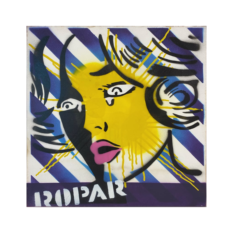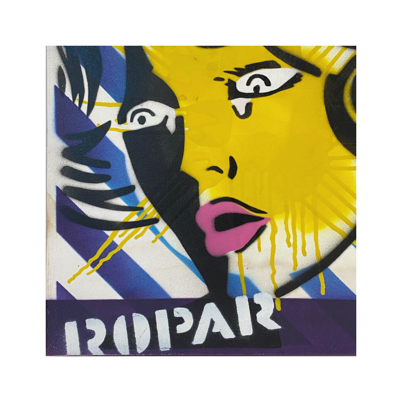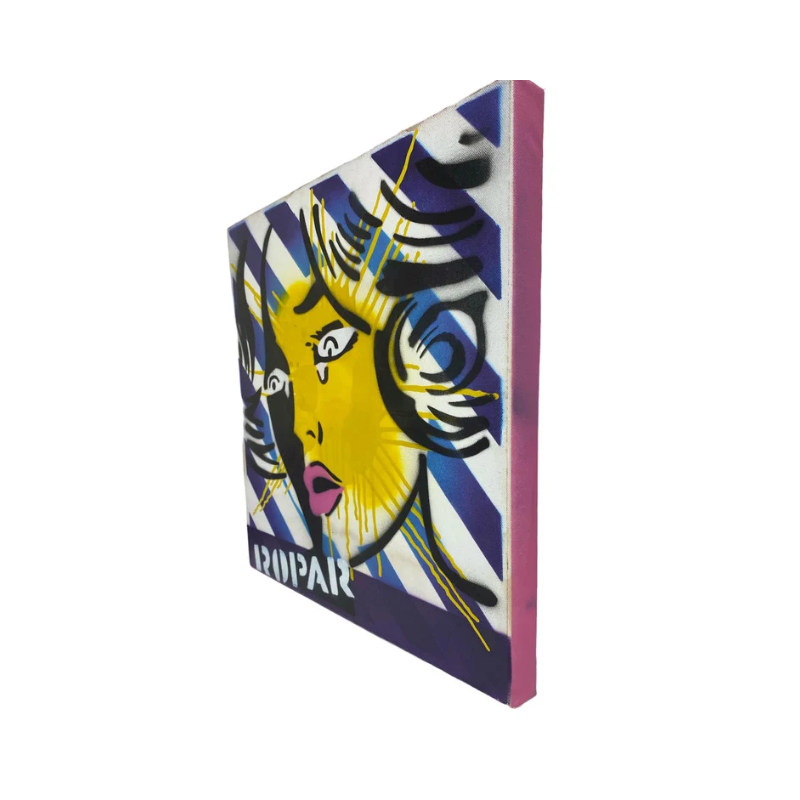 Crying Girl 1 - Homage to Liechtenstein stencil by Dennis Ropar. It measures 510mm x 510mm and comes on a canvas that's ready to hang. This artwork pays tribute to Liechtenstein's iconic style and adds a touch of emotion to any space. It's a powerful piece that will definitely make a statement. Artwork is in good condition with minor crazing. Make sure to check out the photos to get a closer look at the details.