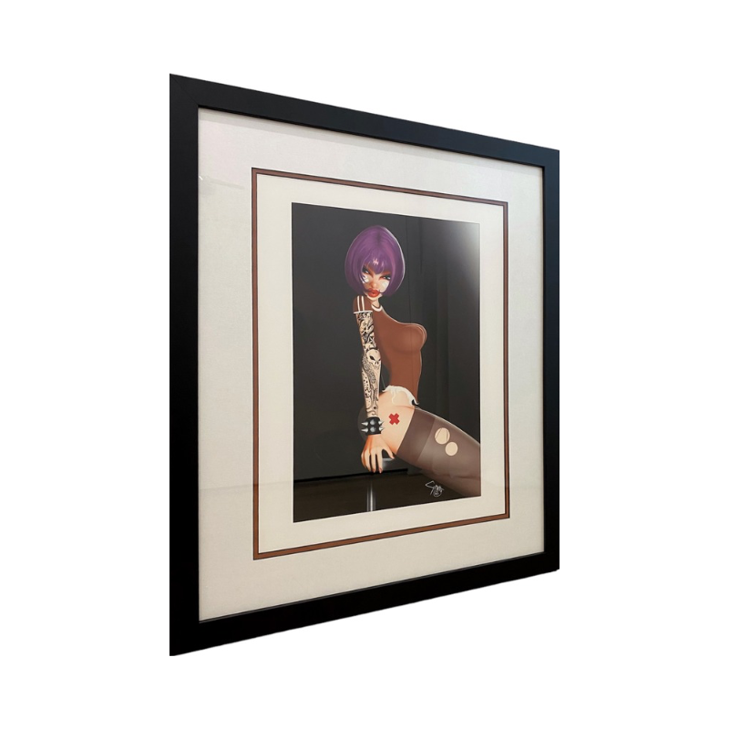Gianluca Mattia’s Rose Mouth is framed highlighting its surreal and detailed design. The artwork’s unique blend of imagery creates a striking visual impact, making it a standout piece. Mattia creates captivating pieces that resonate with viewers on a deep and personal level. His signature style combines elements of surrealism, realism, and fantasy, resulting in artworks that are both visually stunning and emotionally evocative. Through his use of colour, composition, and storytelling, Gianluca Mattia invites viewers to explore the depths of imagination and emotion, offering a glimpse into his creative world filled with wonder and enchantment.