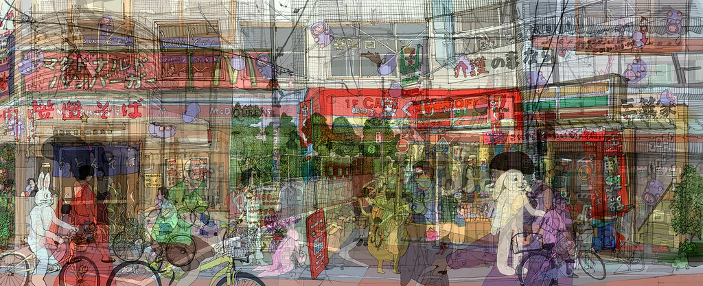 This captivating print is inspired by one of the earliest illustration projects by Kozyndan. They created five panoramic illustrations of street scenes from the Takadanobaba neighbourhood in Tokyo. To capture the overwhelming sensory experience of his first visit, Dan layered these five illustrations, resulting in a vivid, almost psychedelic portrayal of the city's immense energy and chaos